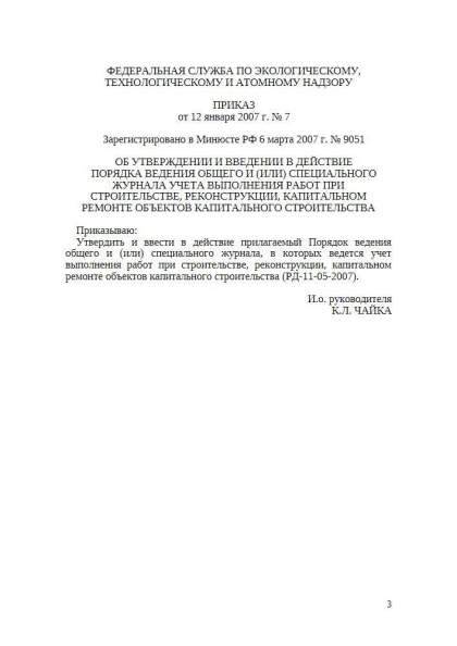РД 11-05-2007 Порядок ведения общего и(или) специального журнала учета выполнения работ при строительстве, реконструкции, капитальном ремонте объектов капитального строительства